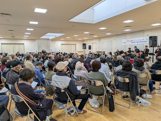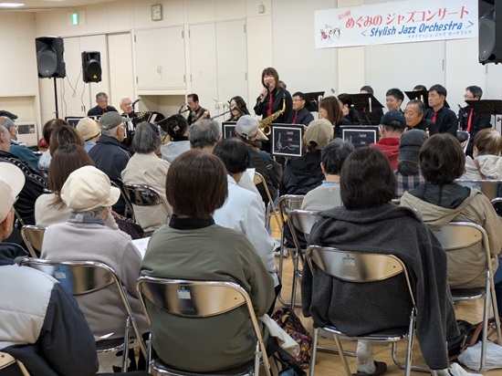 10月11日(土)、恵み野会館で「めぐみのジャズコンサート」を開催しました。 今年は10回目の節目ということもあり、再び「スタイリッシュ ジャズ オーケストラ」をお招きし、 2時間の生演奏を楽しんでいただきました。 18名によるビッグバンドの編成で、10分間の休憩をはさみ全曲16曲を披露しました。 期待も高く来場者は162名、会場はほぼ満席になるという盛況でした。 生演奏を身近に聴けるということで皆さん大満足、最後、アンコールに答えて2曲を演奏し、コンサートを終えました。