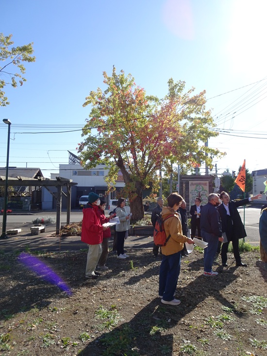 10月21日(火)、千歳警察署から「恵み野交番」建替え工事の概略説明が交番前の現地でありました。 計画では来年4月に完成、5月からの使用開始を目指しているそうで、従来よりモダンな建物になるとのことです。 又、交番の建物の視認性を高めるため、交番周辺の大きな樹木数本を伐採するなどの検討案の説明がありました。 伐採により交番建物の存在が目に入り易くなり、そのことから犯罪や交通事故発生の抑止力に繋がるというものです。 説明会には、市役所建設部、恵み野商店会などが参加しました。