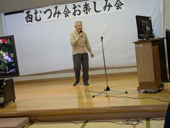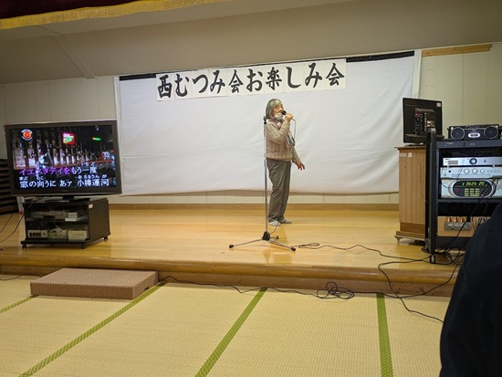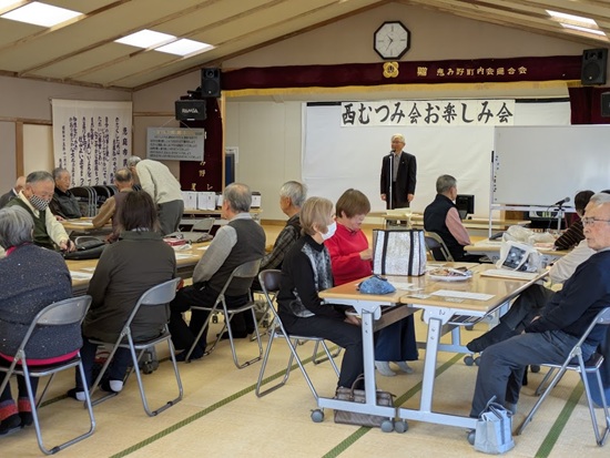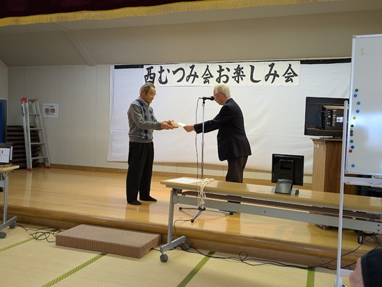 11月27日(木)10:30から、西むつみ会の催事行事「お楽しみ会」が催されました。 参加者は男性20名・女性10名の計30名で、ビンゴゲームや紐取り幸運ゲーム・ジャンケンゲーム・カラオケ等、 食事を挟んで3時間30分、皆さんで楽しい時間を過ごしました。 今年は4丁目の渡邊さんが恵庭市老人クラブ連合会から、永年に渡る活躍に対して表彰された話題が披露されました。