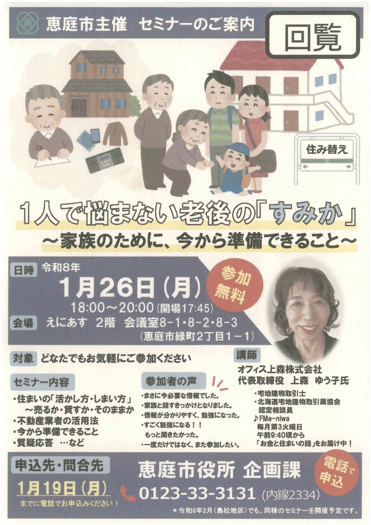 恵庭市民セミナー開催のご案内・ 一人で悩まない老後の『すみか』 |