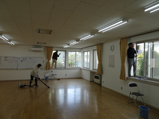 サークルの皆さんは台所・和室・玄関ホールの清掃、役員はホール・トイレ・事務室の清掃とワックス掛け、