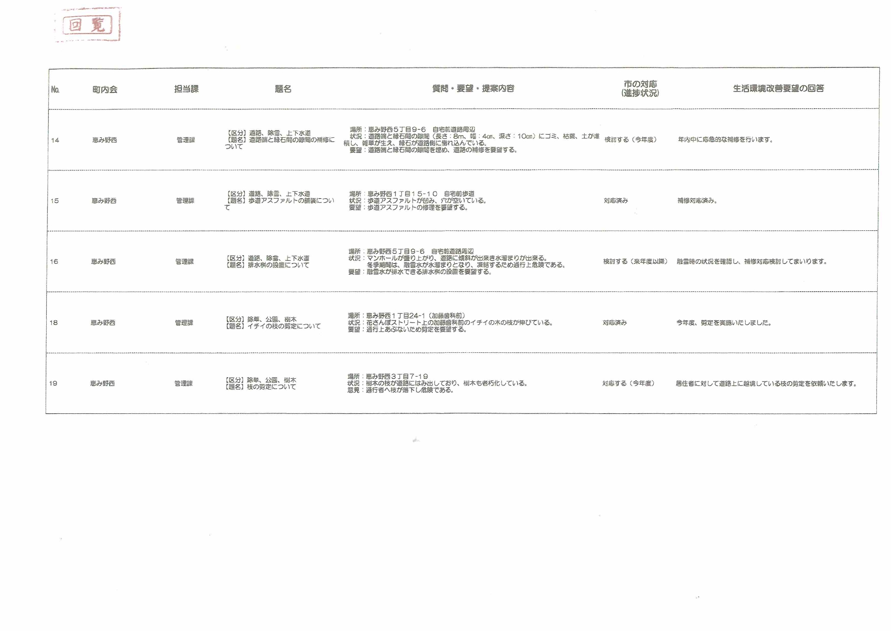 恵庭市・生活環境改善要望の回答 (西町内会分) |