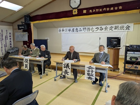 4月10日(金)10:30から恵み野憩いの家で、令和8年度の総会が開催されました。 議長には西6丁目の星野 孝司氏を選出し、令和7年度の事業・会計報告等、 令和8年度の事業計画・会計予算が報告され、新役員の事務局案が承認されました。 令和8年度の西むつみ会の会員数は42名(内女性11名)で、総会の参加者は33名でした。 昼食のあと余興に入り、カラオケなど皆さんで楽しみ、14:00頃総会は無事終了しました。